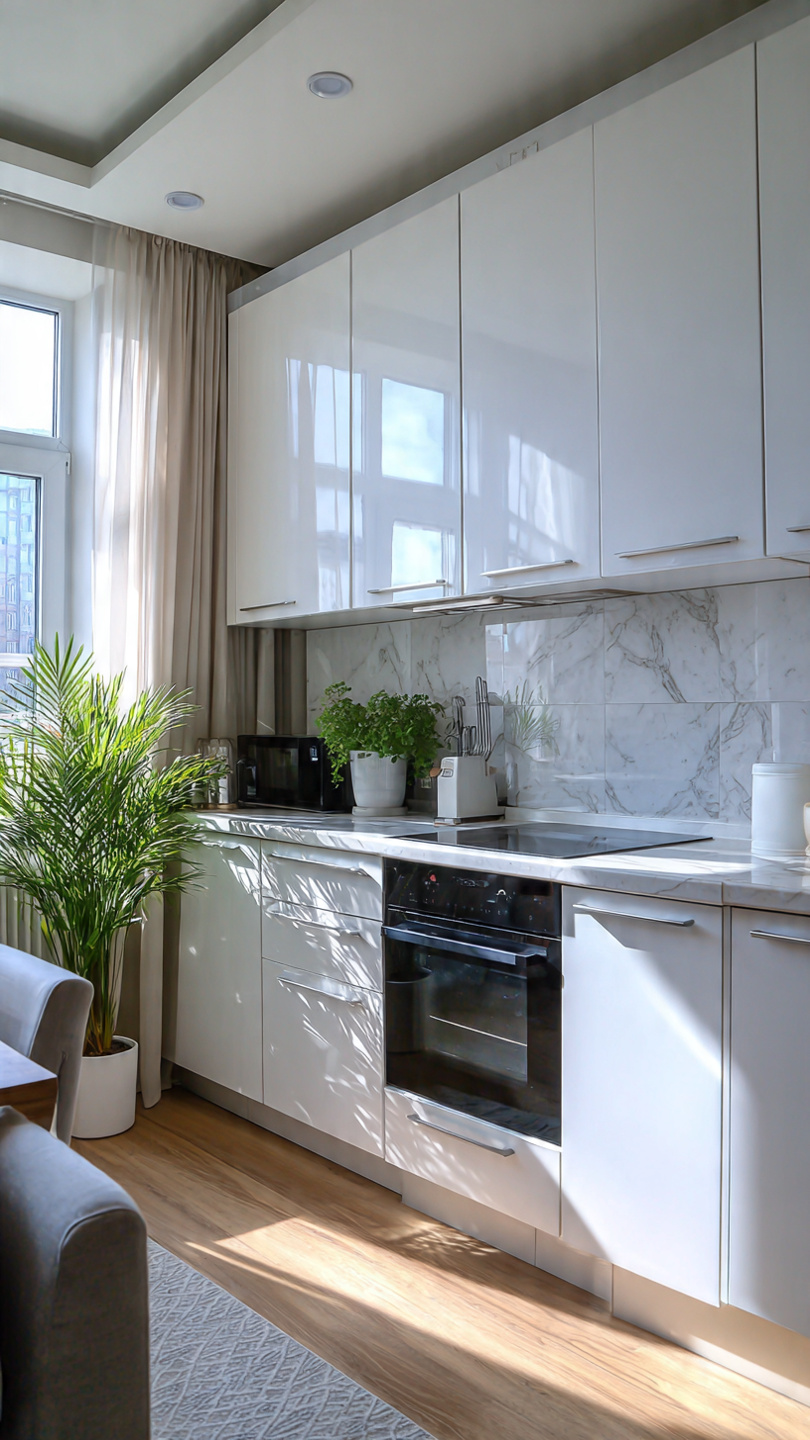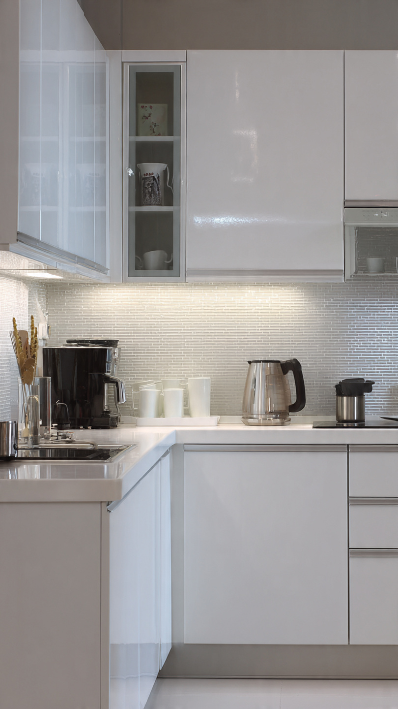 e. Tủ bếp trắng acrylic bóng gương → sang trọng, hiện đại, phản sáng