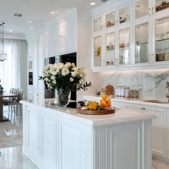 Hình 1: Tủ bếp có đảo màu trắng tinh tế, sang trọng tại Hưng Thịnh Phát