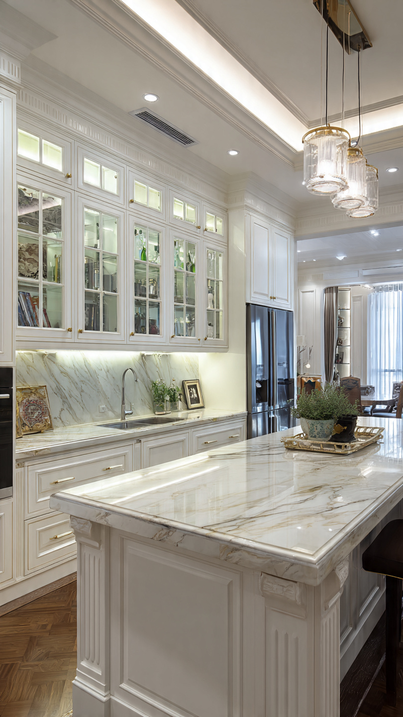 d. Phong cách hiện đại, sang trọng: Màu trắng, nâu gỗ, hoặc kết hợp mặt đá granite, tạo điểm nhấn.