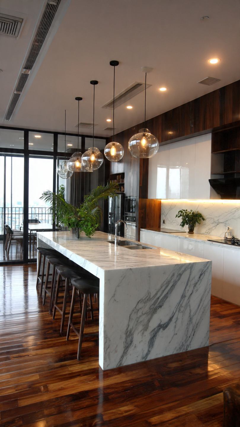 b. Đèn LED dưới đảo bếp: Tạo ánh sáng ấm, sang trọng.