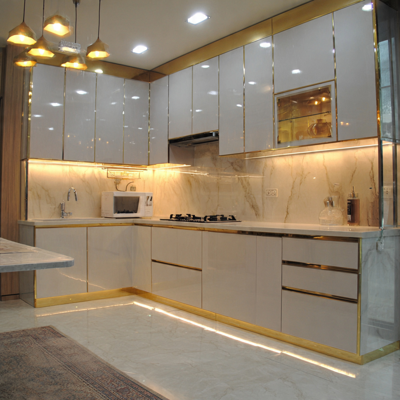 Hình 1 – Tủ bếp nhựa Acrylic bóng gương thiết kế chữ L hiện đại