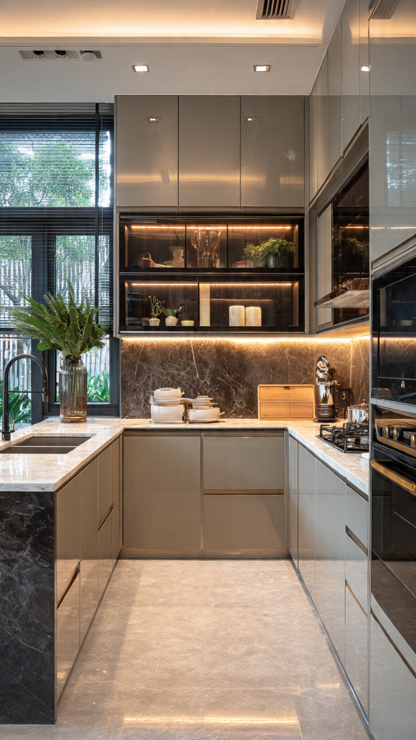 - Tủ bếp chữ U: Phù hợp căn bếp rộng, tăng diện tích lưu trữ.
